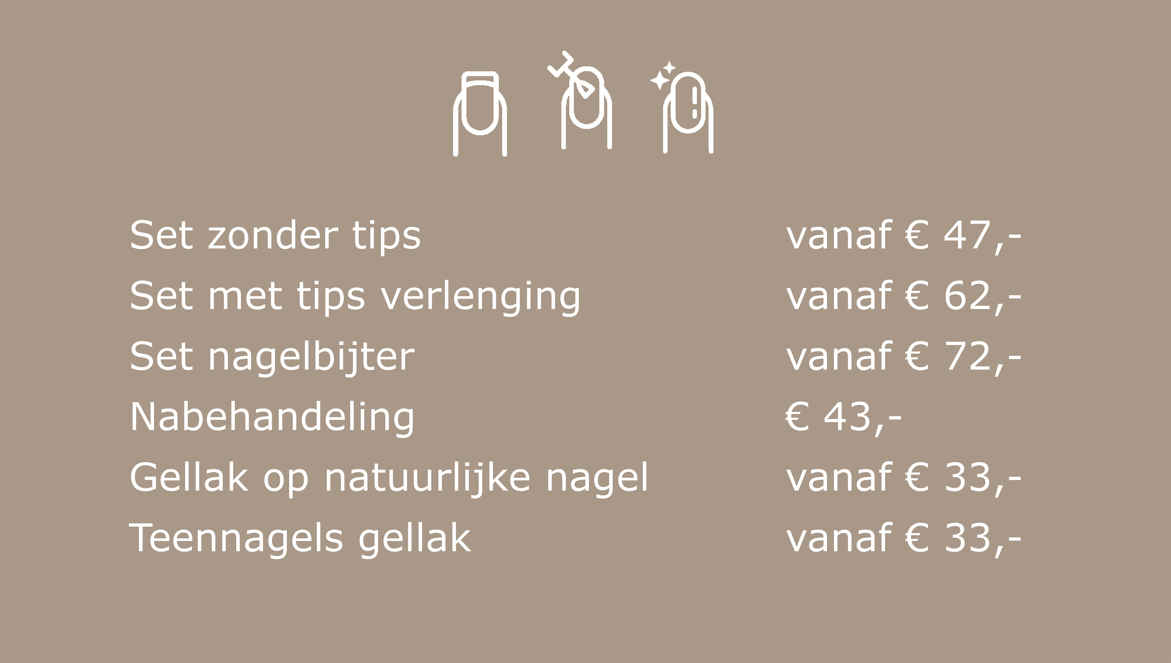 De prijzen voor de behandelingen zijn vanaf-prijzen. Afhankelijk van de conditie van de nagels kan de ene behandeling iets voordeliger uitvallen dan de andere. Iedere set en iedere nagel is anders en daarom stem ik de behandeling volledig af op wat jouw nagels nodig hebben. Er zijn diverse mogelijkheden, zodat je altijd een resultaat krijgt dat past bij jouw wensen en de gezondheid van je nagels. Wil je meer informatie ontvangen? Neem gerust contact met me op.